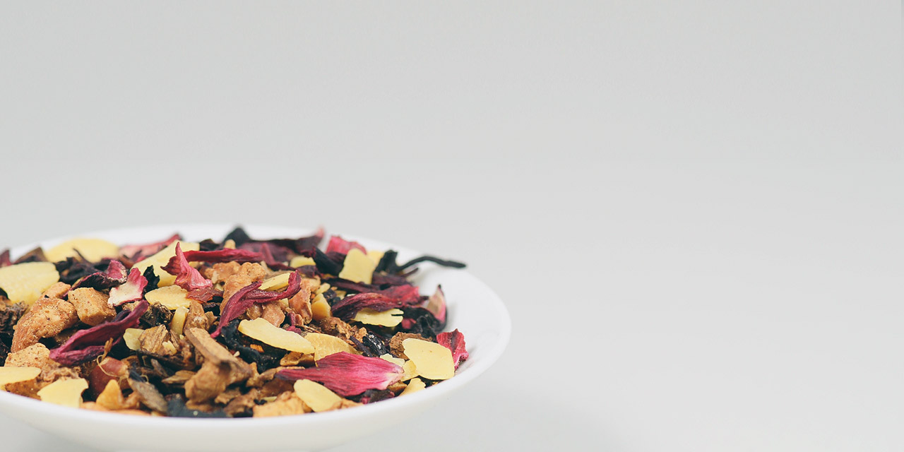 Apfelstücke, Mandeln gehobelt*(15%), Zimt, Rote Beetestücke, Aroma, Hibiskus, Hagebutten, Rooibos, natürlicher Bourbon Vanille-Extrakt