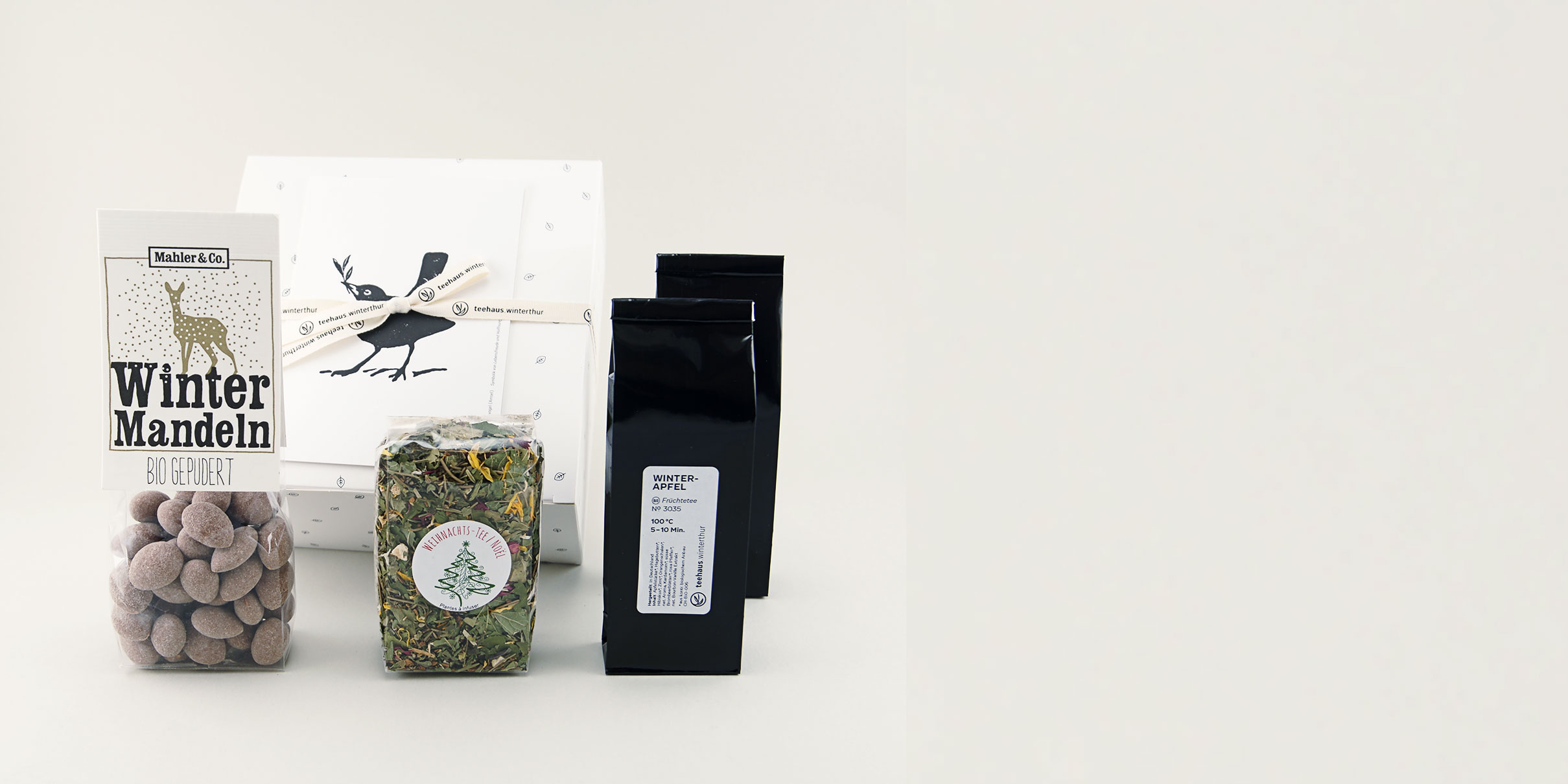 Je 50g Früchtetee Winter Apfel bio*, Rooibos Orange bio*, 40g Schweizer-Bio-Bergkräuter Noël bio *, 140g Wintermandeln bio* {Vollmilchschokolade 69% (Rohrohrzucker*, Kakaobutter*, Vollmilchpulver*, Kakaomasse*), Mandeln* geröstet 29%, Puderzucker*, Zimt*, Orangenöl*} | *aus kontrolliert biologischem Anbau